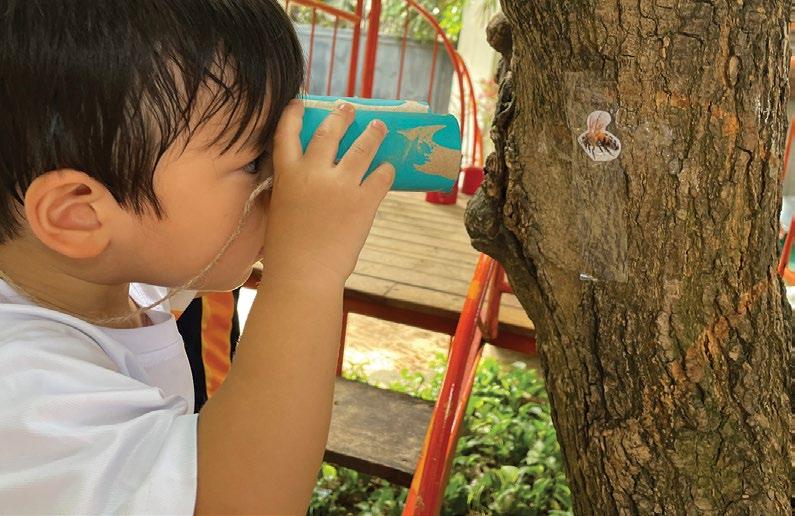 While exploring bees, we had the opportunity to walk around the school looking for different bees. In the Primary Villa, the Junior Primary Two class had set up a ‘bee hotel’ earlier in the year for their exploration. When we went to visit we were very interested and excited to see this hotel, where we could learn more about bee habits.