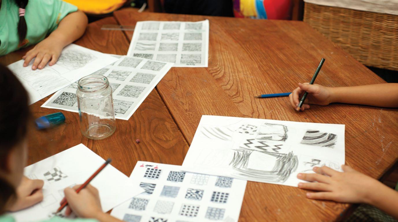 The exploration of charcoal drew us to pencils and patterns. After investigating the different range of pencils, from 7H to 9B, the children drew different patterns. Patterns became a useful tool when cutting into formex tiles, which was the next step in our art encounters.