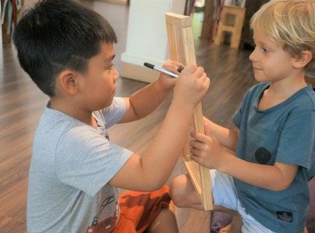 The children revisit and rework their construction corner with recycled materials. After sorting our remeda in the Prep atelier, the children flocked to our building area. First, a set of binoculars is needed for the boat. In their expedition to space, aluminum foil draped over boxes and was rolled into ‘asteroids’. Cardboard houses are filled with portraits and Lego sheep.