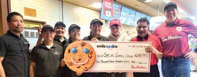 Après la campagne Smile Cookie, Tim Hortons Whitehorse a remis un chèque de 6 341 $ aux Olympiques spéciaux Yukon pour soutenir ses initiatives et programmes locaux. De gauche à droite : Membres du personnel du Tim Hortons du centre-ville de Whitehorse, Alanna Dene et Edward Kaye, athlètes des Olympiques spéciaux Yukon, et Doug Terry, propriétaire et exploitant du Tim Hortons de Whitehorse.