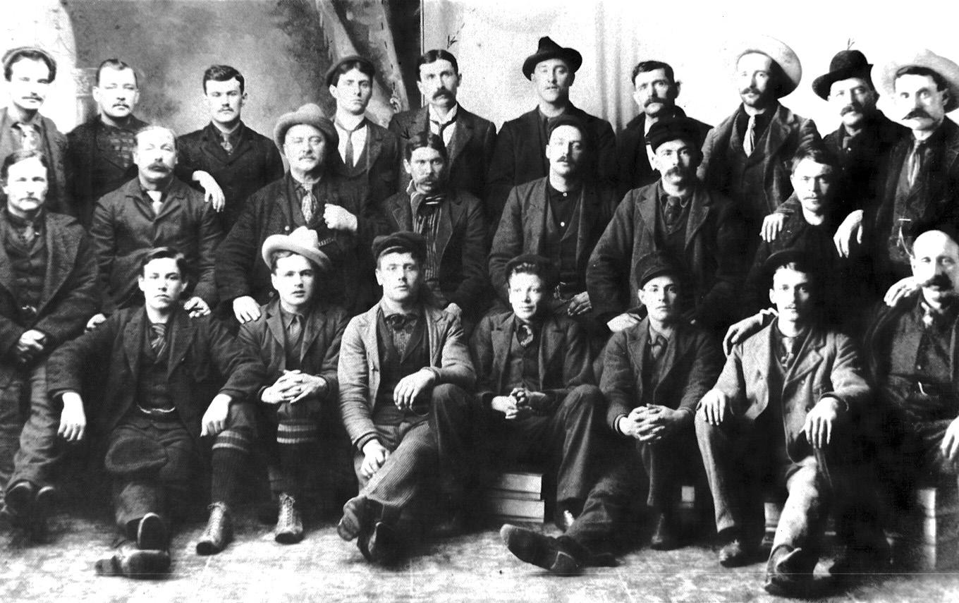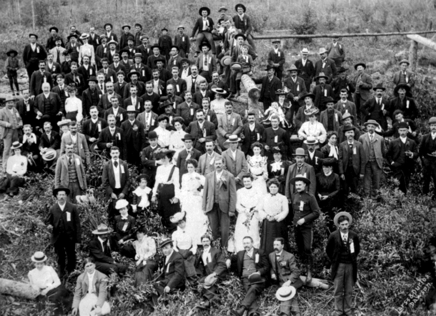 Groupe de Canadiens français de Montmagny (Québec) au Klondike. Les francophones se réfèrent entre eux par leur village d’origine.