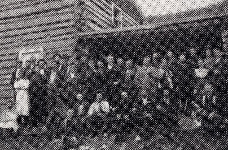 Lorraine Poirier, petite-nièce d’Émilie Fortin-Tremblay, au premier rang, à gauche. « Je parlais français jusqu’à ce que j’aille à l’école à 6 ans », disent plusieurs pionniers et pionnières.