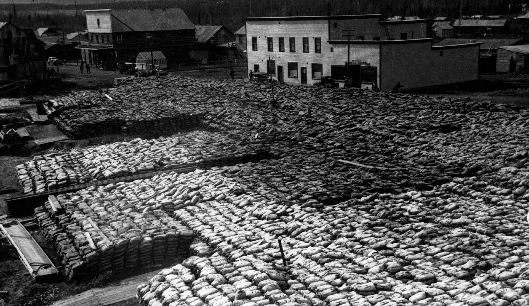Entreposés devant le Château Mayo, sacs de galène en attente de transbordement sur un bateau au printemps.