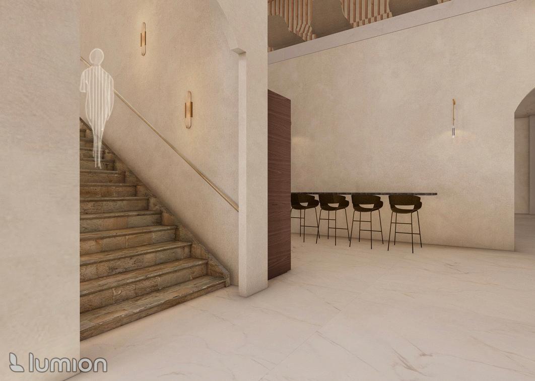 The main staircase is finished with cobblestone flooring and an arch doorway. Inspired by passageways in Italy.