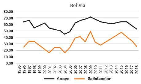 GRÁFICO 5: Apoyo a la democracia y satisfacción con su funcionamiento en Bolivia, Colombia y Ecuador. Latinobarómetro, 1996-2018 p. 407