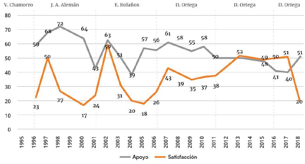 GRÁFICO 18: Apoyo y satisfacción con la democracia en Nicaragua según Latinobarómetro, 1995-2018 p. 431