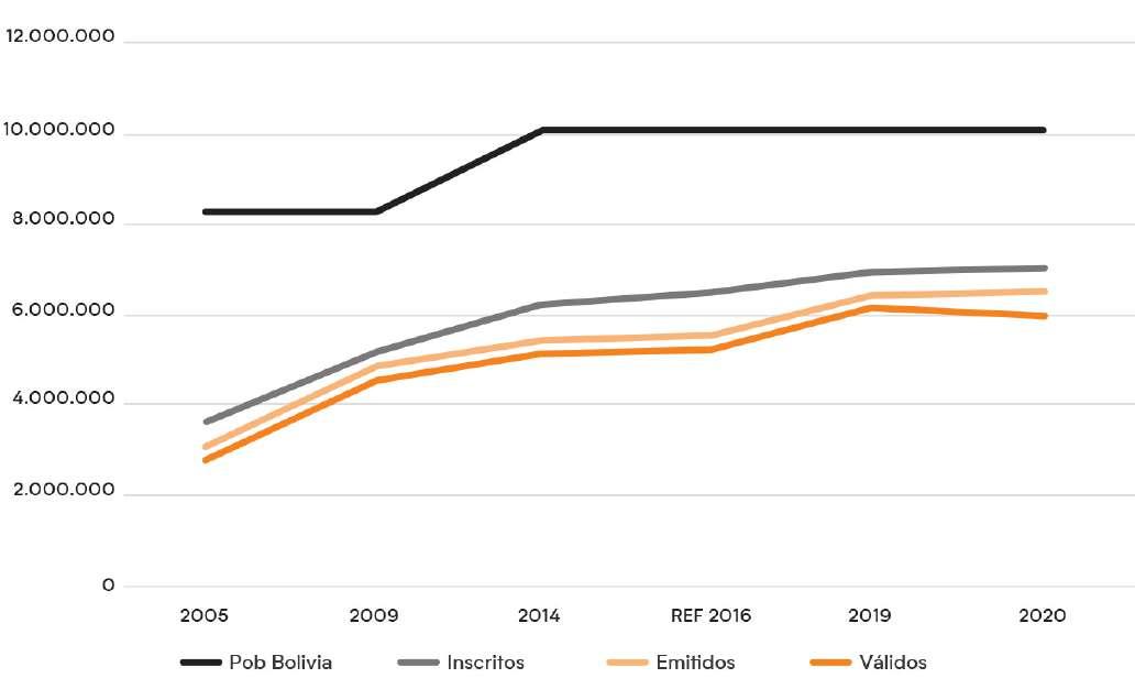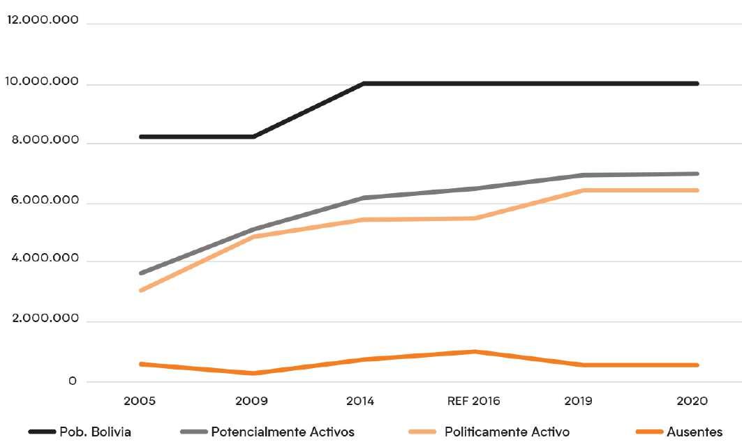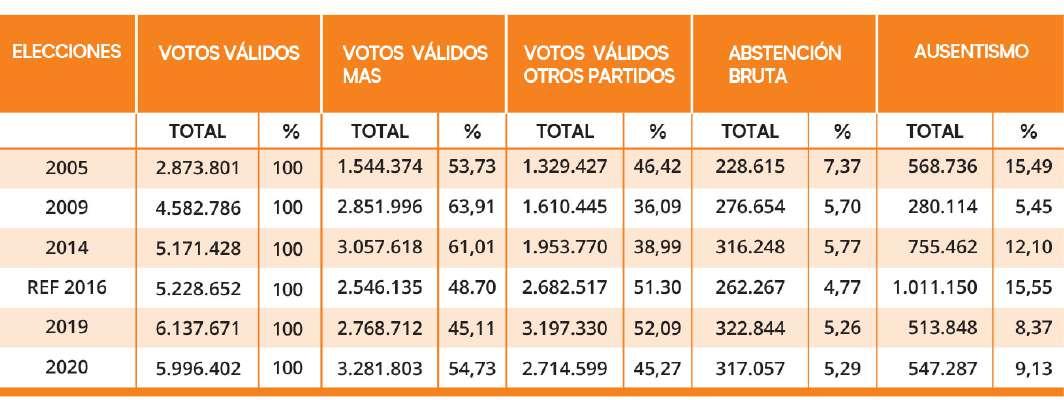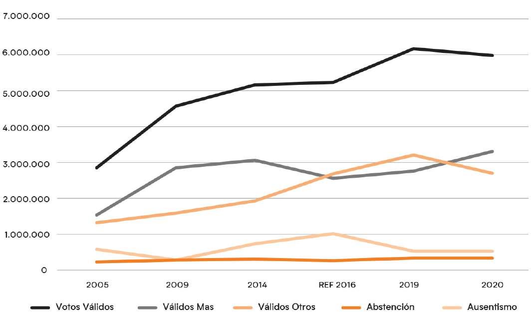 GRÁFICO 5: Elecciones 2005, 2009, 2014, 2019, 2020 y referéndum 2016. Comparación votos MAS / otros partidos p.141