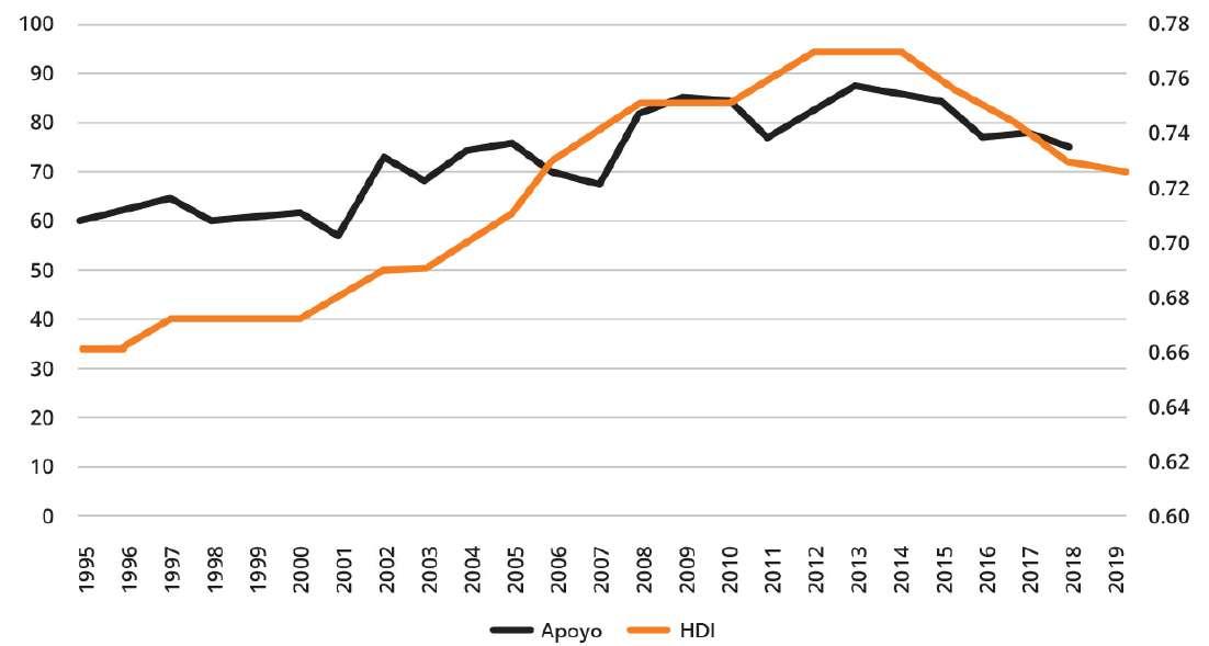GRÁFICO 22: Apoyo a la democracia e Índice de Desarrollo Humano. Venezuela, 1995-2019 p. 438