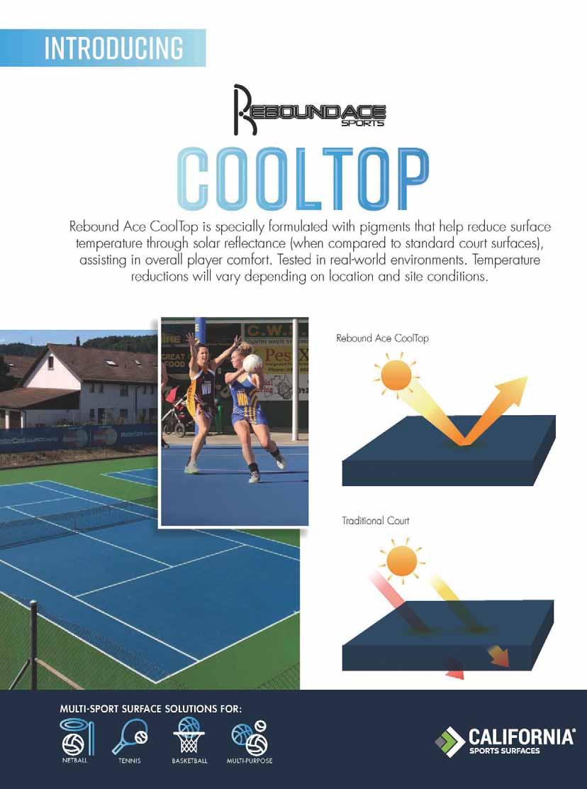 Mindful of Australia’s climate creating demands for shade, cool environments and bio environmentally friendly products, the Rebound Ace CoolTop is a solution for past complaints that acrylic courts are “always too hot”. The release is the culmination of many hours of research and laboratory work and testing having been carried out on some comparison tennis courts located on Queensland’s Sunshine Coast over the past year. Explaining the innovation, Managing Director - Australia for ICP/California Sports advised “our new Topcoats, Rebound Ace Sports CoolTop, have been monitored and measured each month over a range of daily temperatures and conditions. Results thus far, averaged out, result in up to 15% reduction in court surface temperature.” Contact 1800 786 617, E: info-aus@cssurfaces.com, www.californiasportssurfaces.com