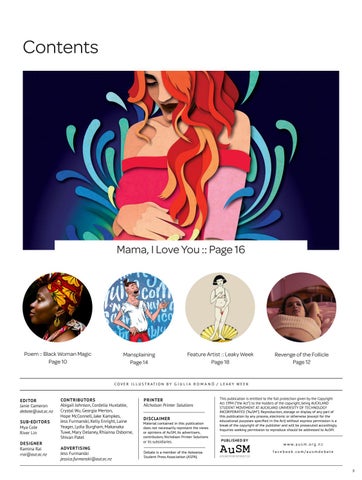 CONTRIBUTORS Abigail Johnson, Cordelia Huxtable, Crystal Wu, Georgia Merton, Hope McConnell, Jake Kampkes, Jess Furmanski, Kelly Enright, Laine Yeager, Lydia Burgham, Makanaka Tuwe, Mary Delaney, Rhianna Osborne, Shivan Patel ADVERTISING Jess Furmanski jessica.furmanski@aut.ac.nz