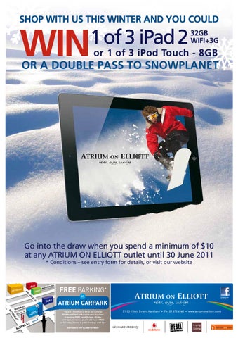 Go into the draw when you spend a minimum of $10 at any ATRIUM ON ELLIOTT outlet until 30 June 2011 * Conditions – see entry form for details, or visit our website