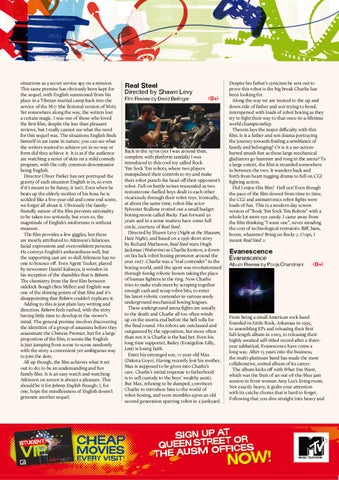 Despite his father’s cynicism he sets out to prove this robot is the big break Charlie has been looking for. Along the way we are treated to the up and down ride of father and son trying to bond, interspersed with loads of robot boxing as they try to fight their way to that once-in-a-lifetime world championship. Therein lays the major difficulty with this film. Is it a father and son drama portraying the journey towards finding a semblance of family and belonging? Or is it a no-actionbarred smash fest as these large mechanical gladiators go hammer and tong in the arena? To a large extent, the film is stranded somewhere in between the two. It wanders back and forth from heart tugging drama to full on CGI fighting action. Did I enjoy this film? Hell yes! Even though the pace of the film slowed from time to time, the CGI and animatronics robot fights were loads of fun. This is a modern day screen version of “Rock ‘Em Sock ‘Em Robots” with a whole lot more eye candy. I came away from the film thinking “I want one”, never minding the cost of technological restraints. Biff, bam, boom, whammo! Bring on Rocky 2. Oops, I meant Real Steel 2.
