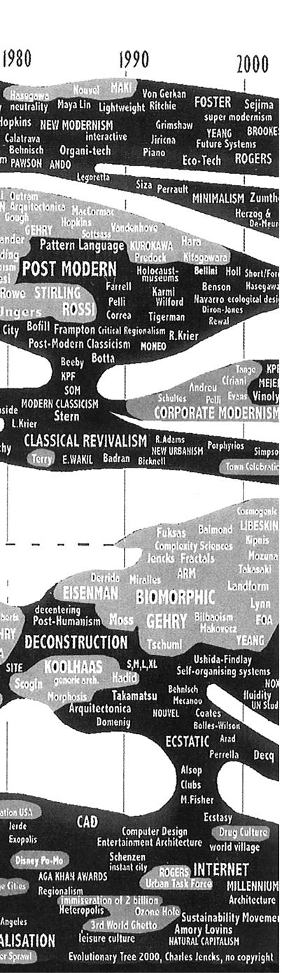 In July of 2000, architectural critic, Charles Jencks, released this diagram in an issue of AR and theorized the history of 20th century architecture. This diagram speaks to how architecture can ba categorized and connected to each other. The negative space, or lack thereof, serves to show distinct separations or connections between ideas and aesthetics.