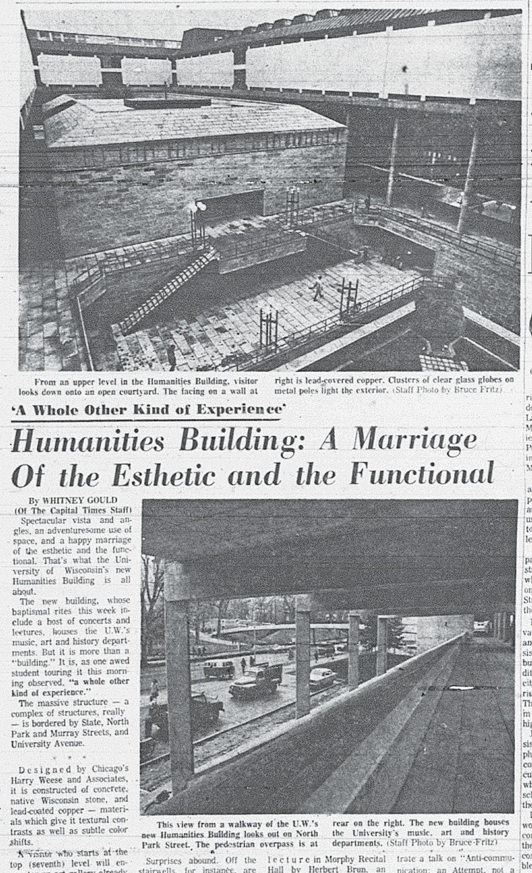 n 1963, the renowned Chicago architect Harry Weese was selected as the architect for the South East Campus Project at the University of Wisconsin – Madison. As the architect, and for this specific project, Weese had a very particular job at hand. There is a lot to consider when making a dramatic change to the built environment on a rapidly growing campus. The original vision from the university was to create three separate high-rise buildings. One building for the art department, one building for the music department, and one building for the history department.
