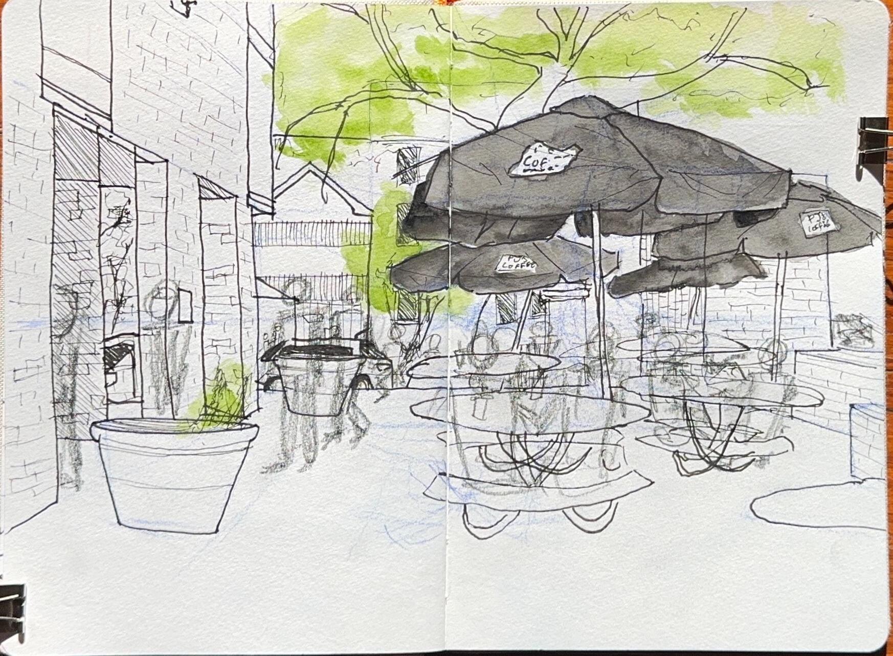 In-situ ink and watercolor sketches as part of a series for an observational drawing class. Pictured at right are 4 views of the cathedral tower of Loyola University of New Orleans campus, each with a 15 minute time limit. Below is a one hour sketch made from a coffee shop patio on Tulane’s campus capturing the movement of students as a print time-lapse