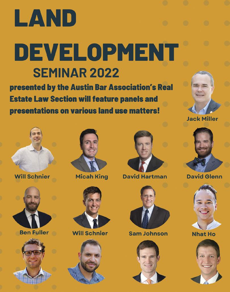 CONTENTS INSID E austinbar.orgONLINE AU ST INL AW Y ER AL AL NOVEMBER 2022 | VOLUME 31, NUMBER 9 NOVEMBER 2022 | AUSTINLAWYER 3 NEWS & ANNOUNCEMENTS Land Development Seminar by Real Estate Law Section Gain CLE hours and join us on Nov. 4. Participate in the Adoption Day Toy Drive on Nov. 3 Contact caleb@austinbar.org for more information. CONNECTIONS