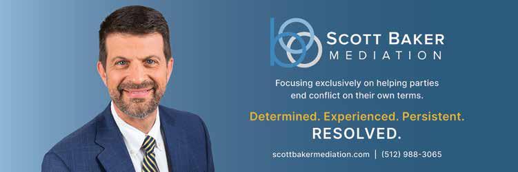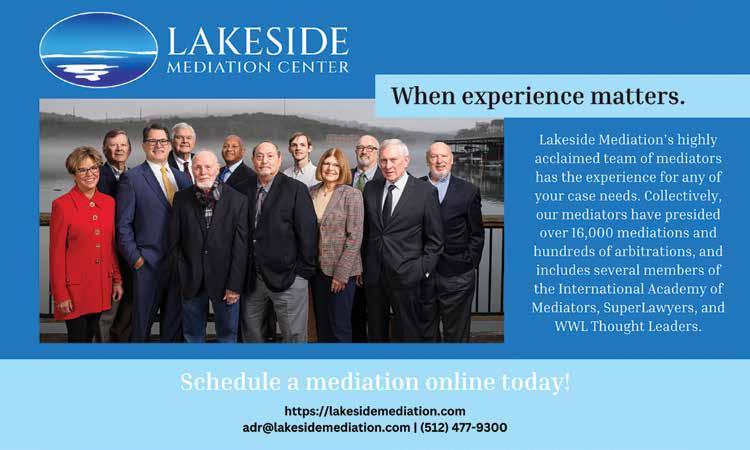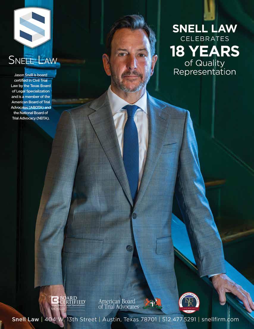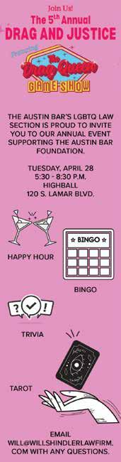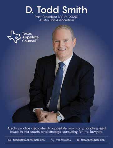 The views, opinions, and content expressed in this publication are those of the author(s) or advertiser(s) and do not necessarily reflect the views or opinions of the Austin Bar Association membership, Austin Bar Association board of directors, or Austin Bar Association staff. As a matter of policy, the Austin Bar Association does not endorse any products, services, or programs, and any advertisement in this publication should not be construed as such an endorsement.