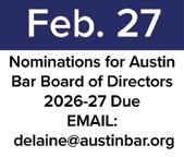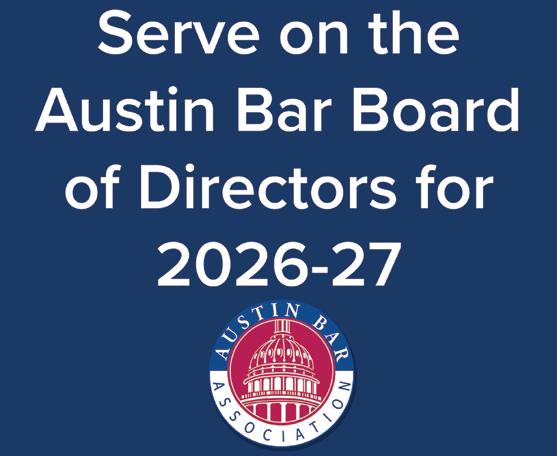 Interested in Serving on the Austin Bar’s Board of Directors? Applications are now being accepted to serve on the Austin Bar’s Board of Directors. This is a great way to get involved in the legal community and make your voice heard. The deadline to apply is Feb. 27, 2026. To submit an application, please view the rules and and submit the form available at austinbar.org/bod-application. Voting will conclude on May 1.
