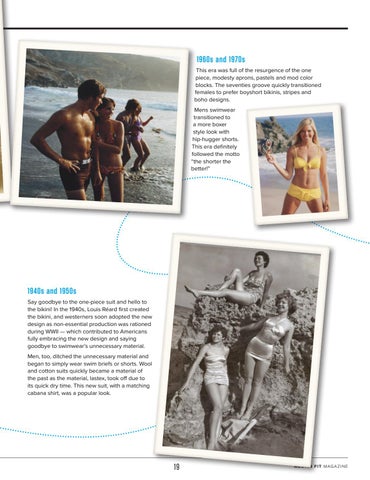 1960s and 1970s This era was full of the resurgence of the one piece, modesty aprons, pastels and mod color blocks. The seventies groove quickly transitioned females to prefer boyshort bikinis, stripes and boho designs. Mens swimwear transitioned to a more boxer style look with hip-hugger shorts. This era definitely followed the motto “the shorter the better!”