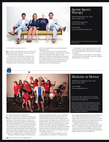Austin Sports Therapy 3303 Northland Drive, Ste. #210 Austin, Texas 78731 422 West Riverside Drive Austin, Texas 78704 512.407.8292 www.austinsportstherapy.com