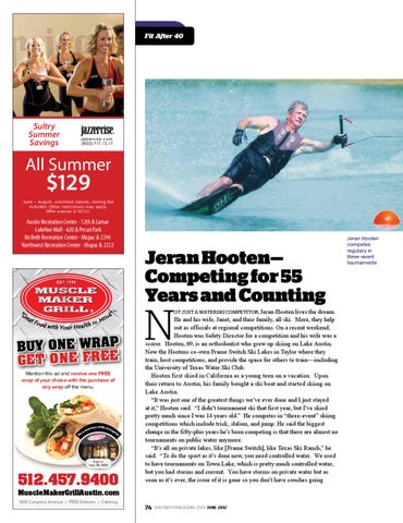 ot just a waterski competitor, Jeran Hooten lives the dream. He and his wife, Janet, and their family, all ski. More, they help out as officials at regional competitions. On a recent weekend, Hooten was Safety Director for a competition and his wife was a scorer. Hooten, 69, is an orthodontist who grew up skiing on Lake Austin. Now the Hootens co-own Frame Switch Ski Lakes in Taylor where they train, host competitions, and provide the space for others to train—including the University of Texas Water Ski Club. Hooten first skied in California as a young teen on a vacation. Upon their return to Austin, his family bought a ski boat and started skiing on Lake Austin. “It was just one of the greatest things we’ve ever done and I just stayed at it,” Hooten said. “I didn’t tournament ski that first year, but I’ve skied pretty much since I was 14 years old.” He competes in “three-event” skiing competitions which include trick, slalom, and jump. He said the biggest change in the fifty-plus years he’s been competing is that there are almost no tournaments on public water anymore. “It’s all on private lakes, like [Frame Switch], like Texas Ski Ranch,” he said. “To do the sport as it’s done now, you need controlled water. We used to have tournaments on Town Lake, which is pretty much controlled water, but you had storms and current. You have storms on private water but as soon as it’s over, the issue of it is gone so you don’t have couches going