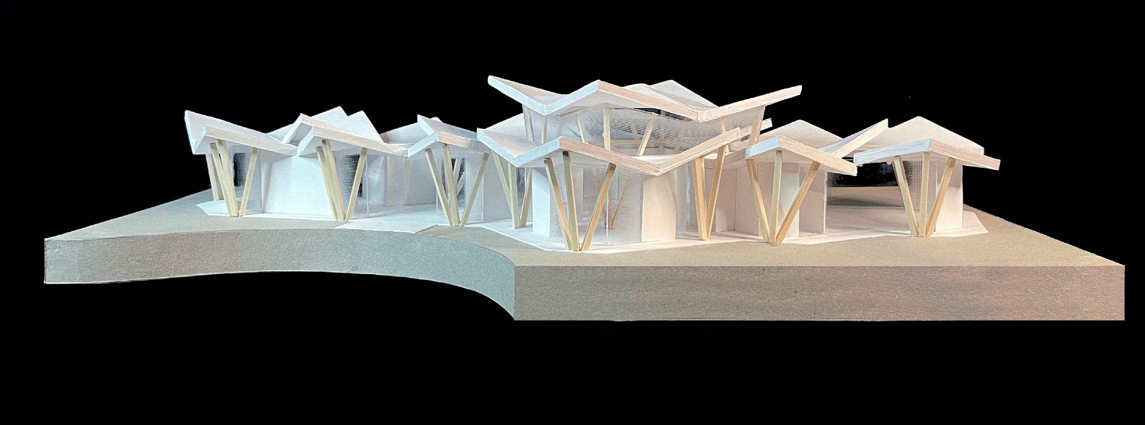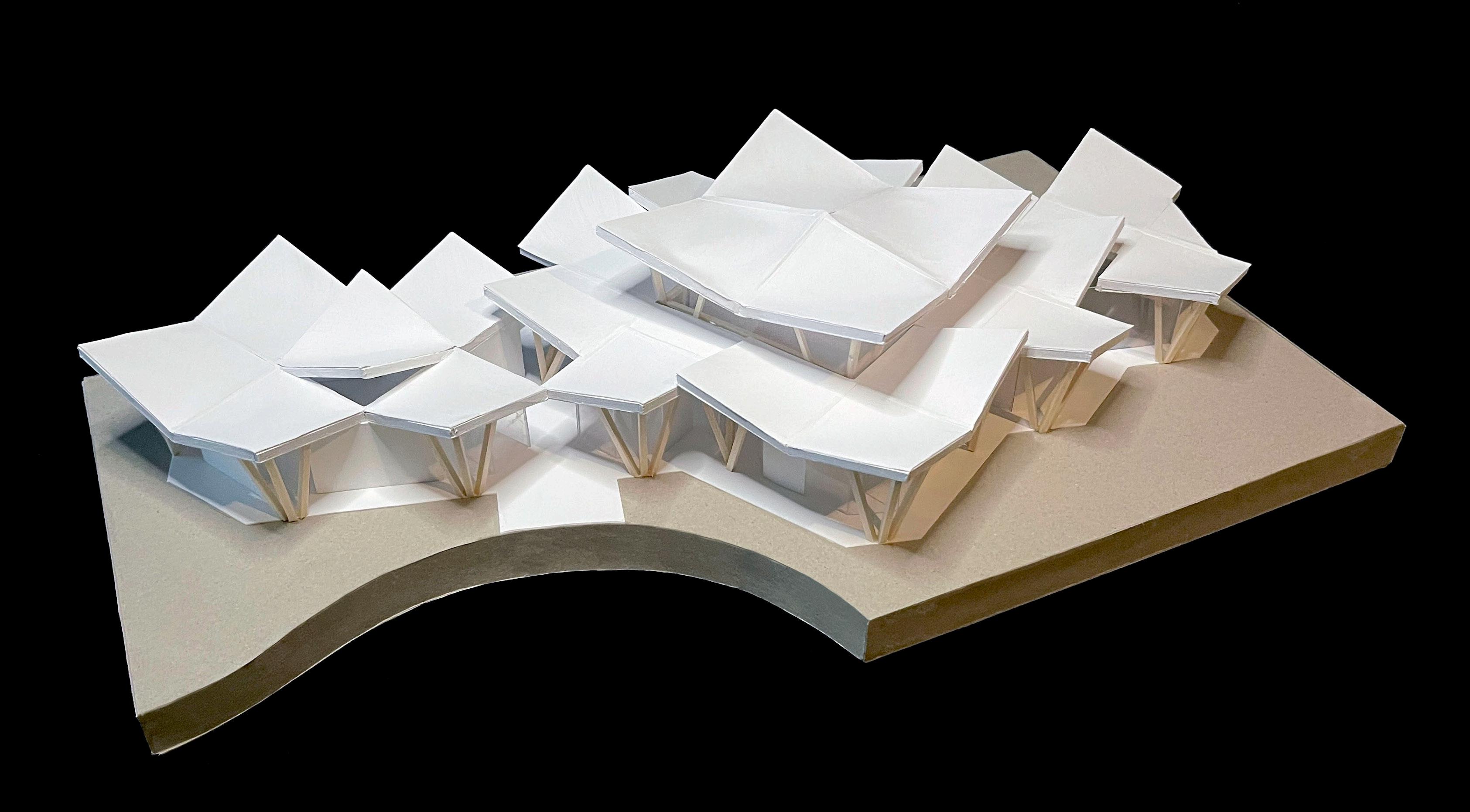 The presence of the model visually displays the unique views from all angles of the building. From the top, the roofs are arranged like a flower, not fully symmetrical yet organized in a clean layout. From the sides, the roofs display a stream of waves, depicting the view of the building from a far distance.