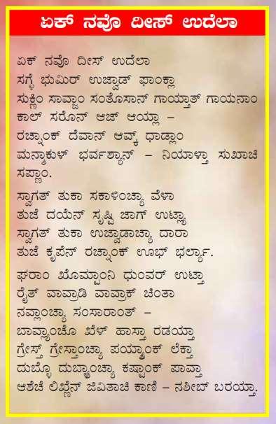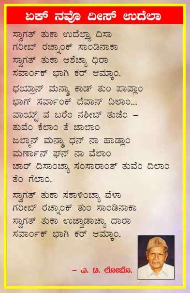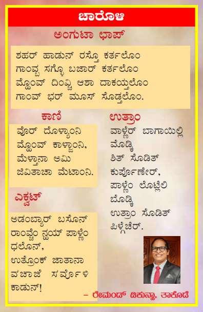 46 ವೀಜ್ ಕ ೊಂಕಣಿ ಜಳ್ರ್ ಟ ೊನಿ ಮೆಂಡೊನ್ಸಾ ನಿಡೊಡೋಡಿ ದುಬಸಯ್) ಆದಾಯಾ ವರಾ ಗ್ಳಂವಾಕ್ ಪಾವ್ಟಯಂ, ಸೈರಾಾಂಕ್ ಕುಟ್ಲ್್ಂಕ್ ಭೆಟ್ ದೇಂವ್ನು ಲ್ಯಗ್ಲಯಂ, ಭೊಂವ್ಟನ್ ಘಂವ್ಟನ್ ಥಕೊನ್ ಗೆಲ್ಲಂ –ರಾತ್ರಂ ಳಾರ್ ಆಡ್‍ಲ ಪಡ್ಯಯಂ. ಗ್ಳಂಯ್ರ-ಗ್ಳಂಯ್ರ ಆವಾಜ್ಯ ಆಯ್ಕುಂಕ್ ಲ್ಯಗ್ಲಯ! ದಳಿಿರ್ ಜಳಾರ್ ಮೂಾಜ಼ಿಕ್ ವಾಹಜಯ್ರ ಲ್ಯಗ್ಲಯ, ಪಿಂತಗ್‍ ಚಡ್ಯಯ ಕಿ ತಂ ಹ್ಯಚ ಚರಾಬ್ –ಭಿಯ್ನರ್ನಸಾಾಂ ದಾಕಾತ್ಲ್ ಆಪೊಯ ರಬಾಬ್! ಚೆಡಂ ಜಳಾರ್ “ಏಡಿಸ್ ಎಗಪಿೊ” ಮಾರಕಾರ್, ಡ್ಚಂಗಾ -ಚಕನ್ಗ್ಳರ್ನಾ ತ್ಲ್ಪ್ ದತ್ಲ್ ವೆಳಾರ್, ಕೆೇರಳಾ, ಡ್ಚಲಿಯ, ಮಹರಾಷ್ೊ್, ಗ್ಲಂಯ್ರ, ಮಂಗ್ಳಾರ್, ಸಗ್ಳಾಾಂನಿ ವಿಸಾಾರ ಸಂಗಂ ಬಂಗ್ಳಾರ್! ಘಟ್ಮುಟ್ ಕುಡಿಚ್ವ ದಢಂಗ್‍ ಹ್ಯಂವ್ನ, ಗ್ಳಂವಾರ್ ಸಗ್ಳಾಾ ಗ್ಳಜಾಾ ಮಹರ್ಜಂ ರ್ನಂವ್ನ, ಪಿಡ್ಚಸಾಾಂಕ್ ದಂವ್ಟಯ ರಗ್ಳಾದಾನಿ ಹ್ಯಂವ್ನ –ರಗ್ಳತ್ ಚಂವ್ಟನ್ ಕೆಲ್ಲ ಲ್ಯಚ್ಯರ್ ಜೇವ್ನ! ಚಡ್ಯಯ ಪಿಂತಗ್‍ ದಲ್ಲ ಮಾರ್ ಜಳಾರಿಕ್, ರಗ್ಳತ್ ಉಸಾಳೆಾಂ ಸಗ್ಳಾಾ ಮಹಜಾಾ ಚದಿರಾಕ್, ಹಂವಾಳೆಾಂ ಆಂಗ್‍ ಜಳಾರ್ ಘಾಣರಾಕ್ –ಹ್ಯಯ್ರ, ದವಾ ಕಸಲಂ ಹೆಂ ಮಹರ್ಜಂ ಗ್ಳಿಚ್ಯಯರ್!