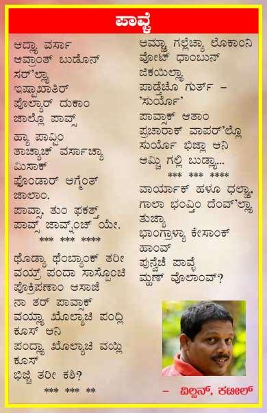 62 ವೀಜ್ ಕ ೊಂಕಣಿ �������������� ಪೊಯೆಟಿಕಾಕವಿಗೇಷ್ಠ್ -18 1) ಜೂನ್ 4 ತ್ಲ್ರಿಕೆರ್ ಆಯಾಾರಾ ಕವಿ ರಬಿನ್ ನಿರಡ್ಚಚ್ಯ ಘರಾಂತ್ ವಕಾಯ ಸಂದಬಾಾರ್ (ತೊ ಬಳಿಯ್ನಂತ್ ಘರ್ ಬಾಂದಾಾ ) ಕವಿಗ್ಲೇಷ್ಠಿ ಕಚಾ ಮುಣ್ ನಿಣಾಯ್ರ ಕೆಲ್ಲಯ . ಪುಣ್ ಕಾರಣಂತರ್ ತ್ಲ್ಣಂ ಜಾಯಾ್ ಮುಣ್ ಸಾಂಗ್ಳಲ್ಯಯಾನ್ ತ್ಲ್ಾಚ್ಚ ದಸಾ ಕವಿಗ್ಲೇಷ್ಠಿ ಆಮೆೆರ್ ಕಯಾಾಂ ಮುಣೊನ್ ಕವಿ ಹೆನಿಿ ಮಸುರೇನಹಸ್ ಆನಿ ಲವಿ ಗಂಜಮಠ ಮುಕಾರ್ ಆಯಾಯಾಂತ್. ತ್ಲ್ಂಕಾಂ ದೇವ್ನ ಬರಂ ಕರಂ.. 2) ಲವಿಟ್ಲ್ ನಕೆಿ ತಸಲ್ಯಾ ಕವಯ್ತ್ರಿಂಕ್ ಬೇವ್ನ ಸಂತೊಸಾಚ ಖಬಾರ್ ಆಸಾ ಹ ಕವಿಗ್ಲೇಷ್ಠಿ ಸಕಾಳಿಂ ಆಸಾಲಿ �� ಉಗ್ಳಾಸ್ ದವರಾ - ಕವಿಗ್ಲೇಷ್ಠಿ ಜೂನ್ 4 ತ್ಲ್ರಿಕೆರ್ ಸಕಾಳಿಂ ಗಂಜಮಠಂತ್ ಆಸಾಲಿ 3) ಕೊಣಂ ಯ್ನದೊಳುಚ್ಚ ಚುಟ್ಟಕಾಂ ಧಾಡಯಾಂತ್ ತ್ಲ್ಣಂ ಏಕ್ ಪಾವಿೊಂ ✋ ಕಚ್ವಾ. 4) ಆನಿ ಕೊೇಣೇ ಭಾಗ್‍ ಘತ್ಲ್ತ್ ತರ್ ಅನಿ ದೊೇನ್ ದಸಾಂ ಬಿತರ್ ತುಮಯಂ 3 ಚುಟ್ಟಕಾಂ ಮಾಕಾ ಧಾಡನ್ ದೇಜಾಯ್ರ ಮುಣ್ ವಿನಂತ್ರ. ದೇವ್ನ ಬರಂ ಕರಂ ನವಿೇನ್ ಪಿರೇರಾ ಸುರತುಲ್. ��������������