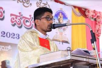 William Saldanha ,Parish Priest, St. Mary's Church, H. D. Kote , at 8am by Rev. Fr. Chinnappa ,Parish Priest, Mother of Humanity Church, Mandya, at 11.30am by Rev. Fr. Vincent M, Parish Priest, O.L of Perpetual Succor Church, Srirampura , at 1.00 pm by Rev. Fr. Valentine R. Kumar ,Parish Priest, Holy Family Church, Hinkal , at 3.00pm by Rev. Fr. Gnanapragasam