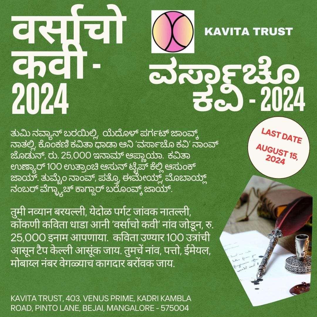 24 ವೀಜ್ ಕ ೊಂಕಣಿ ಕವತಾ ತುಂಅಮ್ರ್ ಮ್ಲಿಾನ್ದರೆಬಯ್್ ಪ್ಡ್್ಂ ಹಾಂವ್ನ ಮೊೀಗರ್ಕವತಚಾೊ . ಜಾಲಂ ಸ್ವಂಗತ್ಣ್ ಮ್ಾಜಾೊ ಜಿವತಾಚೆೊಂ. ಕವತಾ ಮ್ಾಜಾೊ ಮೊಗಚೆಂ. ತುಜೆವಣ್ಣಂಜಿಯ್ಲಂವ್ಡಯ ತರಿೀ ಕಶಂ? ಕವತಾಮ್ಾಕಾ ಜಿವತ್ದಿಂವ್ಡಯ . ಕವತಾವಣ್ಣಂಜಿೀವ್ನ್ಹಂರಿತಂ. ಮ್ಾಜಾೊ ಸವಪಾಾಂಚಿ ರಾಣ್ ತಂ. ಕವತಾಮ್ಾಜಾೊ ಜಿೀರ್ವಚೊಸ್ವವಸ್, ಸದಂಚ್ದಿತಾ ಉಲ್ಸ್. ಕವತಾಮ್ಾಕಾ ಜಿವತ್ದಿಂವ್ಡಯ . ಕವ ರಸ್ಕಾಂಕ್ ತುಂ ಪ್ರೀರಣ್. ತುಕಾ ನ್ಂ ಮ್ರಣ್. ಭೊಗಾಂಚೆಂತುಂಭಂಡ್ರ್. ಕವತಾ ತುಂಸದಂಚ್ಅಮ್ರ್. ಕವತಾಮ್ಾಕಾ ಜಿವತ್ದಿಂವ್ಡಯ . ಉತಾರಂತುಜಿಂ ಮೊರ್ವಳ್. ಅಮ್ಯಾಂಕತಾಾಯ್ಜಿರ್ವಳ್. ರಾಗ್ಅಯಾ್ೊರ್ ವಕಾಳ್. ತುಂಹಾಸ್ವೊಸಪದ್,ಮ್ಯರ್ಮಾಕ್. ಭೊಗಾ ತುಜಿಂ ಜಾಯ್ನ ಪಾರ್ಾಂಕ್. ಕವತಾ ತುಂಮ್ಾಕಾಂಜಿವತ್ದಿಂವ್ಡಯ . ಸಬಾಧಂಚಿತುಂಶಿಂಕಾಲ್. ಮೊತ್ಯಾಂಚೊಸರ್. ತುಂಕಶಂಯ್ವುರೊಂ. ಸದಂಚ್ಮ್ಾಜೆೊಂಗೊ ತುಂಕವತಾತುಂಅಮ್ರ್, ಕವತಾತುಂಅಮ್ರ್.