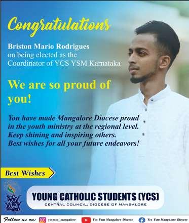 Briston Mario Rodrigues has been appointed as the Regional CoordinatorforYCSYSMKarnataka, following his successful tenure as the Regional President. His