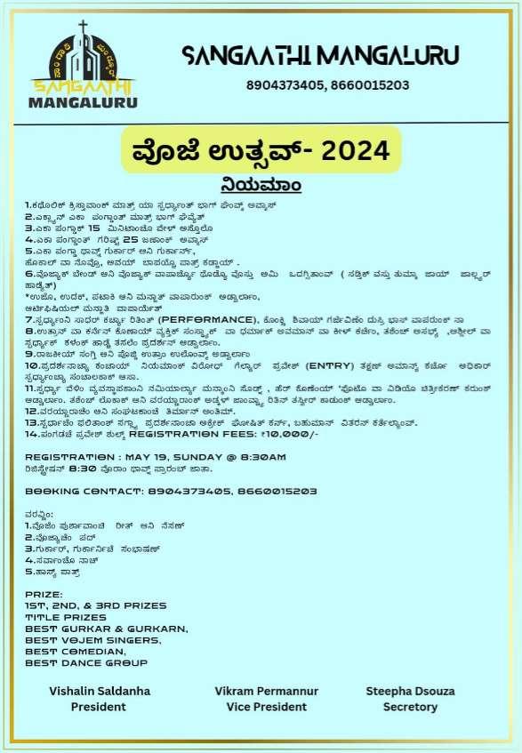 18 ವೀಜ್ ಕ ೊಂಕಣಿ ಜಾತಚ್ಚ ವಶೀಸ್ಲ ಥರಾನ್ ಸಜ್ಯಯಲ್ ಆಕಾಡೊ ಉಗಡನ್ ಕಾಯ್ಲ್ವಚಾಂ ಉಗಾುರ್ಣ್ ಕ್ಲಾಂ. ಕವ ಪೆದುರ ಪ್ರಭು, ತಕೊಡನ್ ಸಾ್ಗತ್ ಕ್ಲ್. ವೆದಿರ್ ಅಧಾಕ್ಷ್ ಜಾವ್ಕ್ ತಕೊಡ ವಗಾರ್ ಮಾ|ಬ್| ರೀಹನ್ ಲ್ೀಬೊ, ಮುಖೆೀಲ್ ಸಯೆರ ಜಾವ್ಕ್ ತಕೊಡಗಾರ್ ರಚ್ಯಡ್ವ ಮರಾಸ್ಲ, ಗಾಂಟಲ್ಟ್ಟು ವಗಾರ್ ಮಾ|ಬ್| ರನಲ್ಾ ಡ್ಚಸೊೀಜಾ, ಪ್ಣ್ಯೆಟ್ಲಕಾ ಅಡ್ಚ್ನ್ ನವೀನ್ ಪಿರೀರಾ ಸ್ತರತ್ಲ್, ಗೊವಿಕ್ರ ಪ್ರರ್ದ್ರತಕೊಡಉಪಾಧಾಕ್ಷ್ಫಾರನಿಾಸ್ಲ