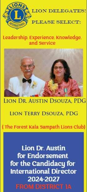 Ln Dr Austin D’Souza Prabhu’s life serves as a testament to the power of service, leadership, and cultural preservation.His44yearsinLionism have transformed communities through initiatives such as VisionFirst and Lions Open University.Hiscommunityservicein Forest Park has fostered diversity andunity,resultinginastreetbeing named in his honour. His contributions to Konkani culture have preserved a rich heritage for future generations, earning him