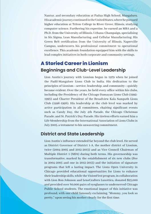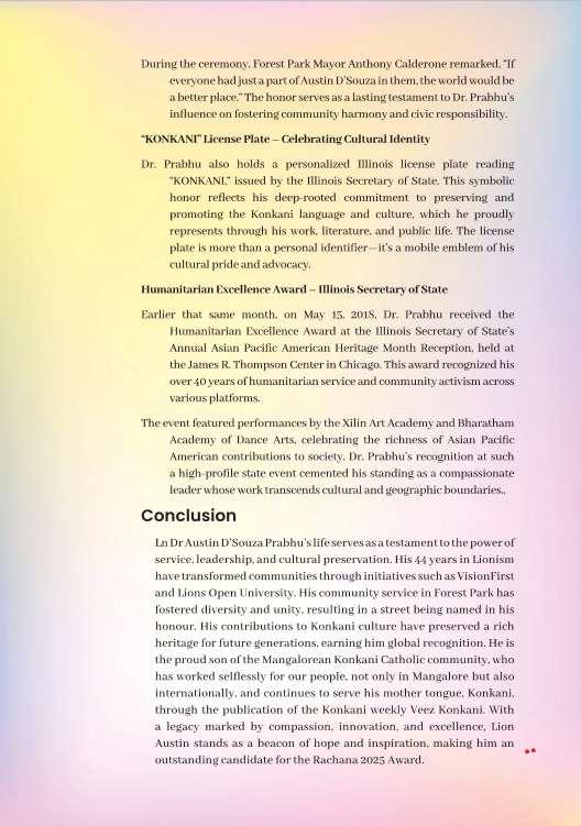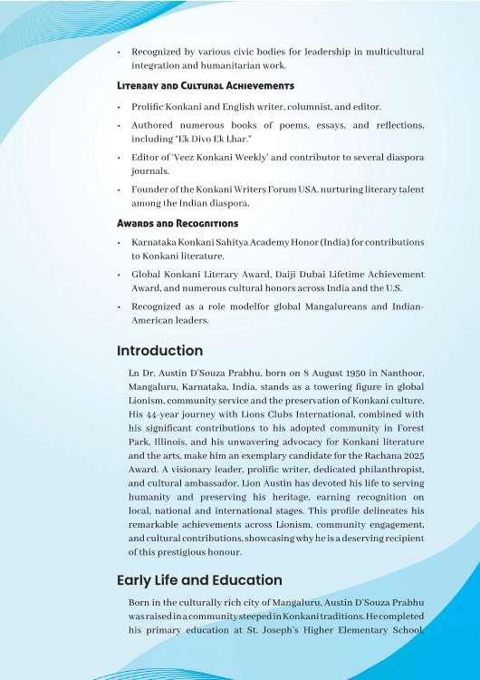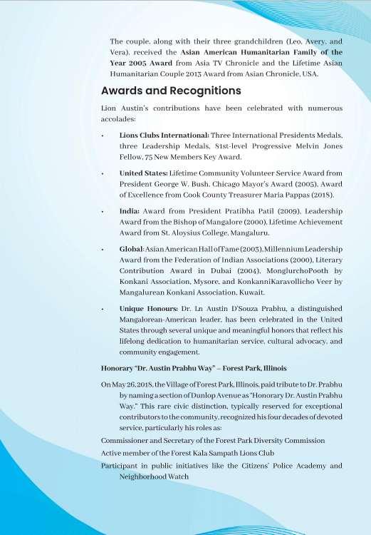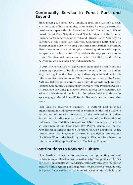 adopted community in Forest Park, Illinois, and his unwavering advocacy for Konkani literature and the arts, make him an exemplary candidate for the Rachana 2025 Award. A visionary leader, prolific writer,dedicatedphilanthropist,and cultural ambassador, Lion Austin has devoted his life to serving humanity and preserving his heritage, earning recognition on local, national and international stages. This profile delineates his remarkable achievements across Lionism, community engagement, and cultural contributions, showcasing why he is a deserving recipientofthis prestigioushonour.