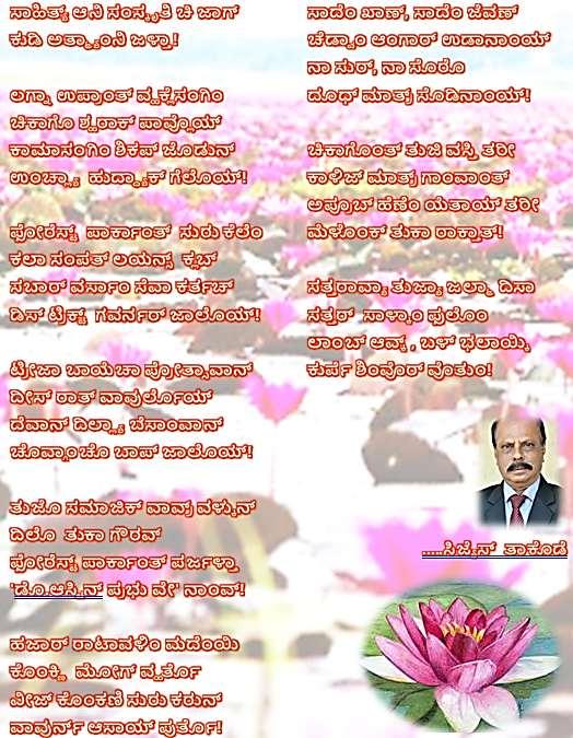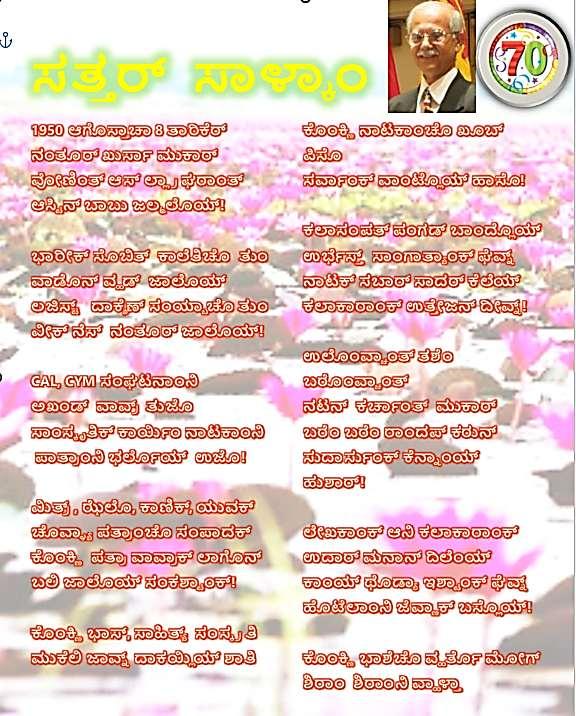 and over 3,500 poems in Konkani, Kannada, and Tulu. Notable works includeAdarshYuvajann,whichwon theBestEducationalBookforYouth Award from the Konkani Bhasha Mandal, Goa, and Ankwar Selly, a one-act play that received the Best Drama Award from the same organisation. Other published works include Adosantlim Fulam, Motiyam, Vozram (a collection of 3,500 poems), and Videshantlo KonkanniPormoll.Hiswritingshave appearedinanthologiesbyKonkani stalwarts like Valley Quadras and Melwyn Rodrigues, and his biography is featured in Visavya Dashakache Mhaan Monis by Dr. GerryPinto.