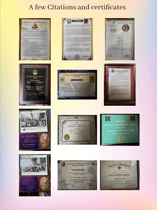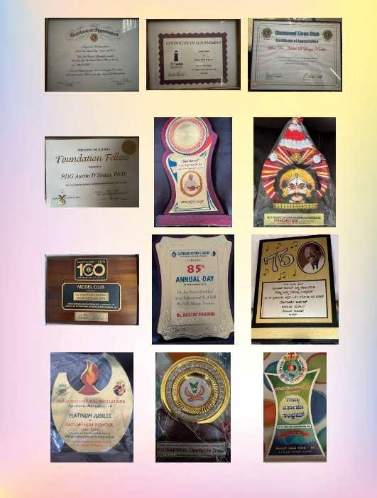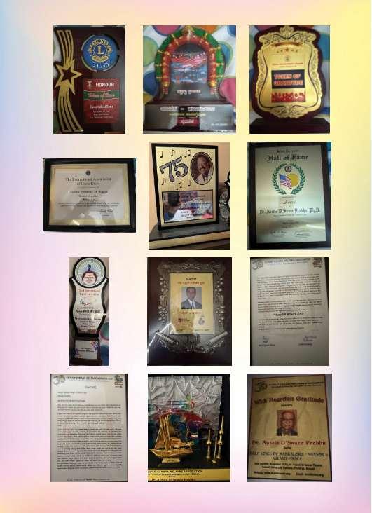 • India: Award from President Pratibha Patil (2009), Leadership Award from the Bishop of Mangalore (2000), Lifetime Achievement Award from St. AloysiusCollege, Mangaluru.