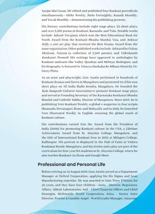 Lion Austin’s dedication to preserving and promoting Konkani culture is unparalleled. A prolific writer, actor, and publisher, he has enriched Konkani literature and performing arts through a lifetime of creative work. Beginning in Mangaluru, he wrote short stories, poems,andjokesforperiodicalslike Poinnari, Raknno, Mithr, Jhelo, and Aanjm Mai Gaum. He edited and published four Konkani periodicals simultaneously—Mithr Weekly, Jhelo Fortnightly, Kannik Monthly, and Yuvak Monthly demonstrating his publishing prowess.