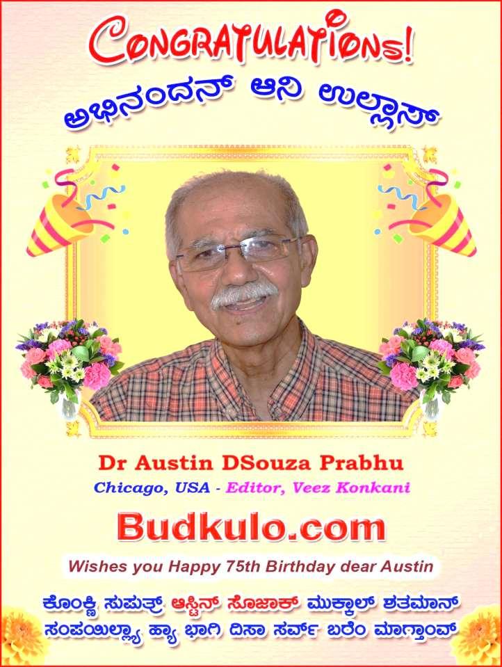 A voice is heard from heaven’s bower, loud and clear, saying, “This is my beloved son, in whom I am well pleased” Mt17:5. Felicitating Dr AustinPrabhuontheoccasionofhis Platinum birthday, we hear the echoesofthesewordsoftheGospel proclaimed on August 6th, when we celebrate the feast of the Transfiguration of Jesus;onceagain today, on August 8th, the day God the creator sent forth this treasure into our world, way back in 1950 through the choice of his noble parentsGaulbertD’SouzaandRose D’ Souza in Mangalore, known as the ‘Rome of the East”, a surprise gift wrapped in many layers of lovely qualities to celebrate and to cherish. This ‘Monglurcho kunvor’ wasdestinedtobloomandblossom in the American soil. The creator is taking delight in this masterpiece who is turned out to be a genius, a slender prodigy of 5’5’’ height,