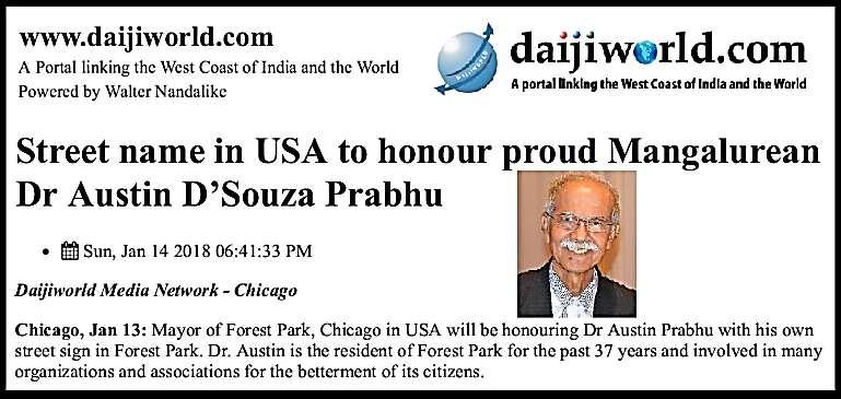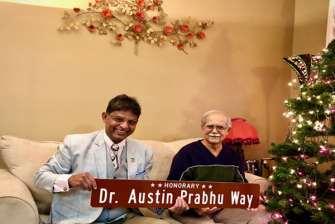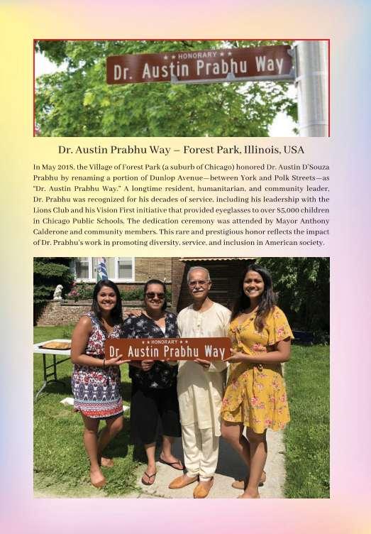 In May 2018, the Village of Forest Park(a suburb of Chicago) honored Dr. Austin D’Souza Prabhu by renaming a portion of Dunlop Avenue between York and Polk Streets as “Dr. Austin Prabhu Way.” A longtime resident, humanitarian, and community leader, Dr. Prabhu was recognized for his decades of service, including