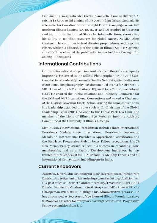 On the international stage, Lion Austin’s contributions are equally impressive.HeservedastheOfficial Photographer for the 2016 USACanada Lions Leadership Forum in Omaha,Nebraska,attendedbyover 2,000 Lions. His photography has documented events for District 1A, MD1, Lions of Illinois Foundation (LIF), and Lions Clubs International (LCI). He chaired the Public Relations and Publicity Committee for the 2007 and 2017 International Conventions and served as Chairman of the District Governor Elects’ School during the same conventions. His leadership extended to roles such as CoChairman of the Global Leadership Team (2011), Advisor to the Forest Park Leo Club, and member of the Lions of Illinois Eye Research Institute Advisory Committee at the UniversityofIllinois,Chicago. Lion Austin’s international recognition includes three International Presidents Medals, three International President’s Leadership Medals, 18 International President’s Appreciation Certificates, and the 81st-level Progressive Melvin Jones Fellow recognition. His 75 New Members Key Award reflects his success in expanding Lions membership, and asaFacultyDevelopmentInstructor, he has trained future leaders at 20 USA-Canada Leadership Forums and 18 International Conventions, includingoneinIndia.