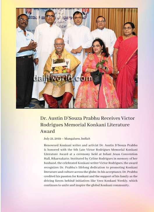 Dr. Austin D’Souza PrabhuReceives VictorRodrigues MemorialKonkani LiteratureAward July21,2019 – Mangaluru,India8