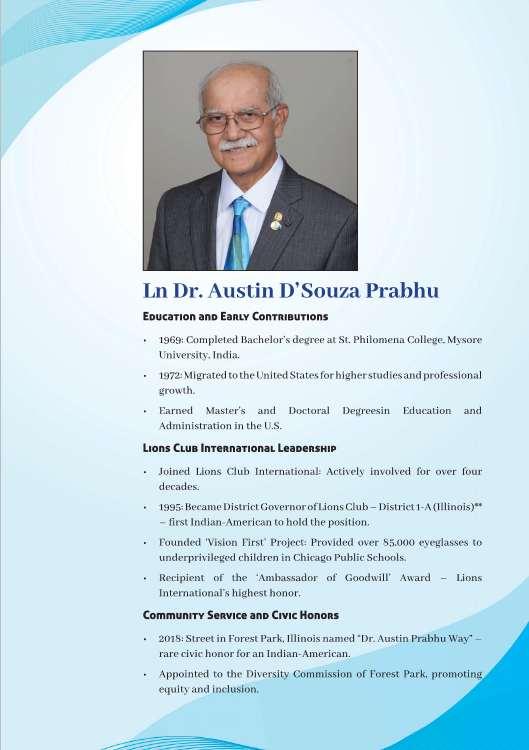 Ln Dr. Austin D’Souza Prabhu, born on 8 August 1950 in Nanthoor, Mangaluru, Karnataka, India, stands as a towering figure in global Lionism,communityserviceandthe preservation of Konkani culture. His 44-year journey with Lions Clubs International, combined with his significant contributions to his