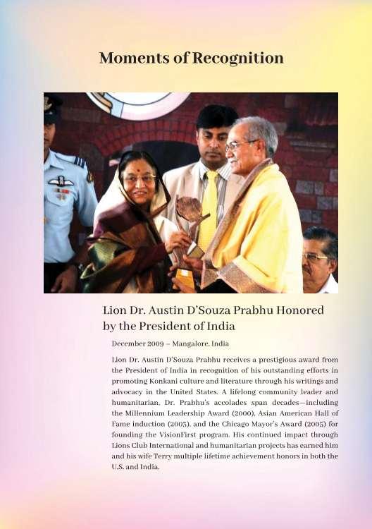 Lion Dr. Austin D’SouzaPrabhu HonoredbythePresidentofIndia December2009 – Mangalore,India