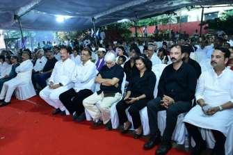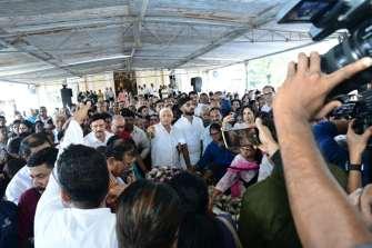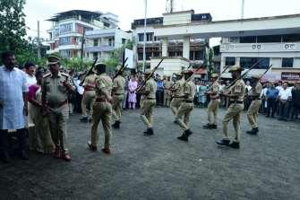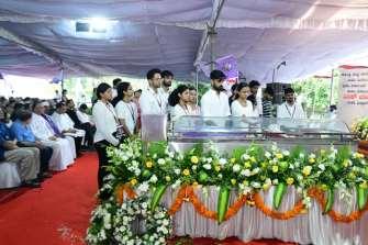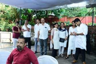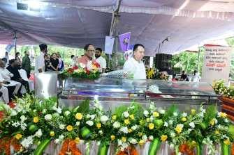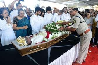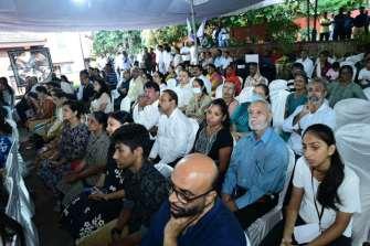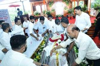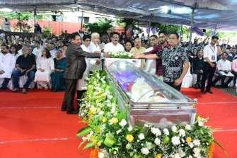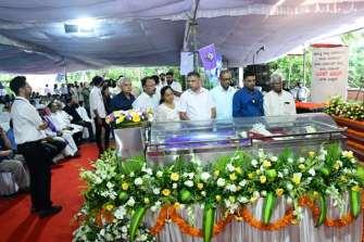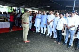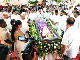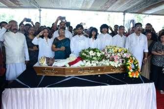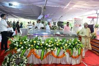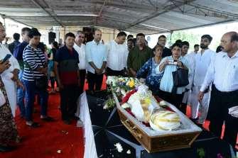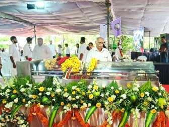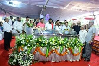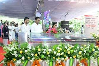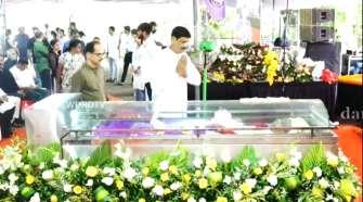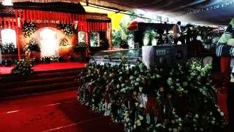 for the State Funeral with the Police brass band and gun salute. The healthl minister and the other government officials were present. After this at 1.00 pm the body was taken to Kalaangan (an artistic complex for performance arts), Shatkinagar for public viewing. There a large pandal and stagesl werepreparedfortheevent.Mandd Sobhann Troupe which was formed