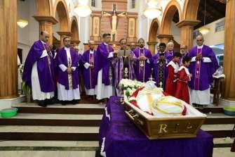 sacristy a number of priests came and told me that they were really touched the way I spoke. I was surprised to hear this, because rarely priests have given me the feedback.Asahabit,Idonotexpect orp long for the appreciation. After the Mass the body was kept outside thechurchina largepandal