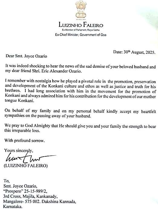 Henry J. Pinto, and Past Chairman Victor Edward D’Souza, together with his family and Walter Nandalike, Founder of Daijiworld,paidtheirsolemnrespectsinMangaloretoBabEricOzario — a true pillar and guiding light of Konkani culture. Hisunmatcheddedication,melodiousvoice,andfar-reachingvisionhaveleft an indelible mark on our language and heritage. May his noble soul rest in eternalpeace,andmayhislegacycontinuetoinspiregenerations.
