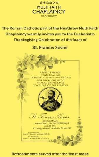 Iampleasedtoannounceortellyou thatforthefirsttimeeveraKonkani Mass will be held to celebrate St. Francis Xavier feast(Patron of Goa/ India) at St George chapel at Heathrow Airport London. The Eucharist Mass will be held on 3rdDecat14:00 hrs.LT.