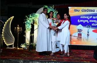 The main sponsors, donors who contributed materials, and all benefactors who donated ₹1 lakh and above were felicitated by Bishop Robert with a St Lawrence memento as a token of gratitude and love. Bishop Robert Miranda himselfwasfelicitatedbytheparish clergy, the Vice President, and the Secretary of the PPC with a shawl, memento, fruits, and a flower bouquet.
