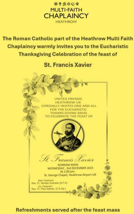 Iampleasedtoannounceortellyou thatforthefirsttimeeveraKonkani Mass will be held to celebrate St. Francis Xavier feast (Patron of Goa/ India) at St George chapel at HeathrowAirportLondon. The Eucharist Mass will be held on 3rdDecat14:00hrs.LT.