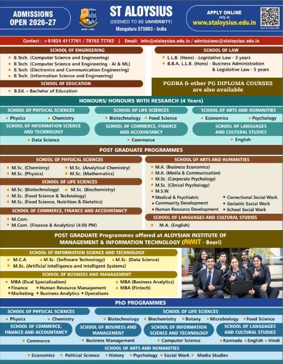 As St Aloysius (Deemed to be University) moves confidently throughits extraordinary 146-year legacy, it continues to uphold the Jesuit tradition of forming men and women for others who excel not onlyinknowledge,butincharacter, leadership and service. The Universitystandsattheforefrontof modern higher education with a forward-looking academic framework, cutting-edge infrastructure, strong industry collaborations and comprehensive student support systems that prepare learners for a rapidly evolvingworld.Rootedinaheritage that has shaped generations of thinkers, visionaries and changemakers, St Aloysius invites aspiring students to join a legacy that elevates intellectual curiosity, nurtures human excellence and inspires a lifelong commitment to serving society with purpose and compassion.